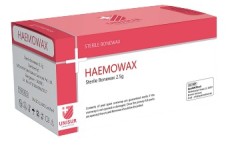 COMPOSITION: Cire d‘abeille blanc raffinée, paraffine et palmitate d‘isopropyle INDICATIONS: contrôle des saignements des surfaces osseuses en agissant comme barrière mécanique PRESENTATION: une pièce de 2.5 g par Pochette stérile, boites de 12