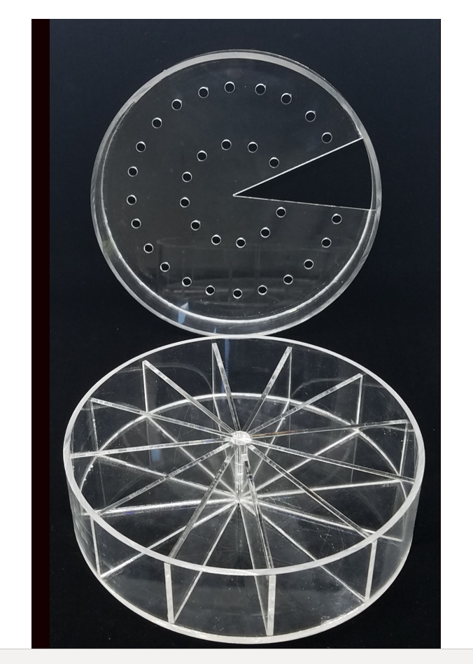 Dispositif de contention en acrylique, assemblé en deux parties pour l’irradiation corporelle totale de souris de laboratoire.