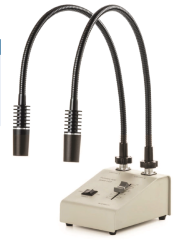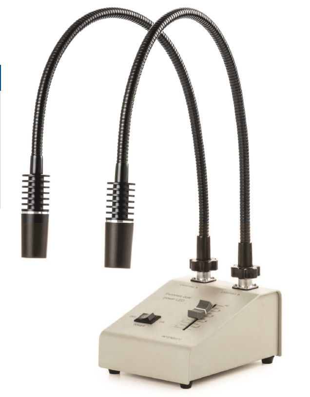 Éclairage LED double – Source lumineuse équipée de deux guides flexibles autoportants de type « gooseneck », chacun doté d’une LED blanche haute puissance de 3 W (6500 K). Chaque guide LED autoportant est muni d’une tête de focalisation à 3 lentilles et possède une longueur de 56 cm.