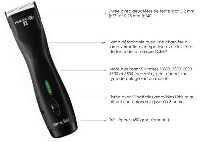 3300 et 3800 tours/min.) pour couper tout type de pelage sec ou mouillé